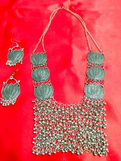 OXIDISED SILVER POLISH LOTUS FLOWER NECKLACE SET