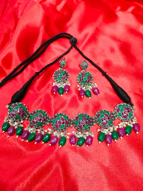 LUXURY GERMAN SILVER MULTI CHOCKER SET WITH EARRING
