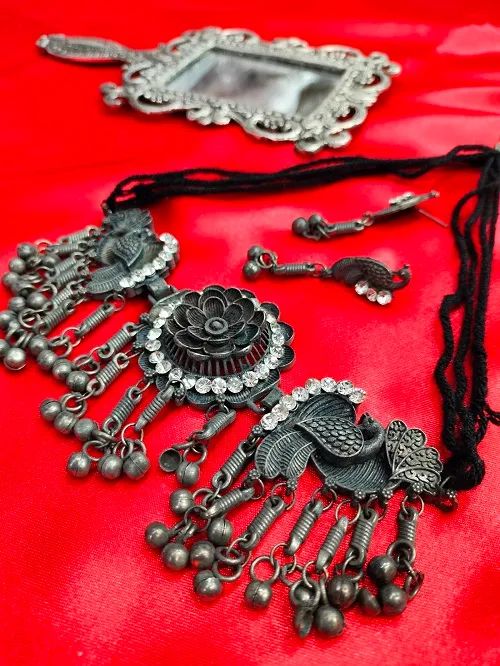 OXIDISED WHITE STONE BLACK POLISH NECKLACE SET WITH EARRING